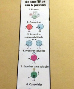 Este marcador de livros permite que a criança/ jovem transporte consigo os 6 passos para a resolução de conflitos, podendo, em caso de necessidade, relembrar os passos a dar.